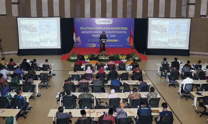 Bogor, Badan Pengawas Pemilihan Umum - Bawaslu menggelar Pelatihan Penguatan Kompetensi Anggota Bawaslu Kabupaten/Kota Periode 2023-2028. Dalam kesempatan ini, Anggota Bawaslu Herwyn JH Malonda meminta agar seluruh jajaran yang baru terlantik dapat menjaga integritas lembaga.