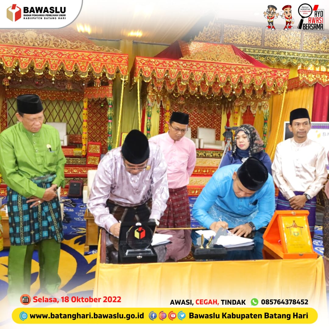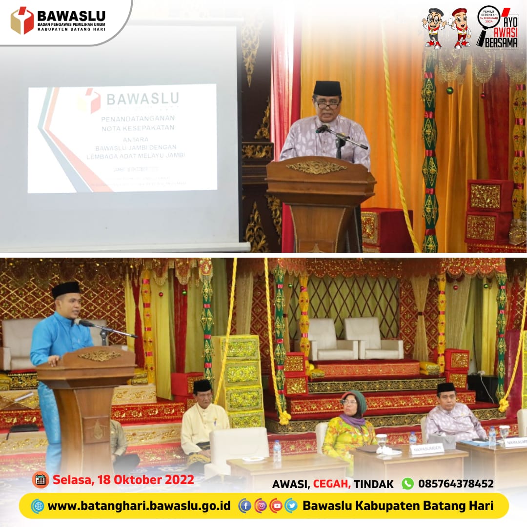 Penandatanganan nota kesepakatan atau Memorandum of Understanding (MoU) dilakukan oleh Ketua Lembaga Adat Melayu Jambi Datuk Temenggung Putro Joyodiningrat Drs. H. Hasan Basri Agus, M.M dan Ketua Bawaslu Provinsi Jambi Wein Arifin, S.IP., M.IP, yang disaksikan oleh Anggota Bawaslu Provinsi Jambi dan Kepala Sekretariat Bawaslu Provinsi Jambi serta pengurus LAM Jambi Provinsi Jambi dan LAM Kabupaten/Kota se-Provinsi Jambi.