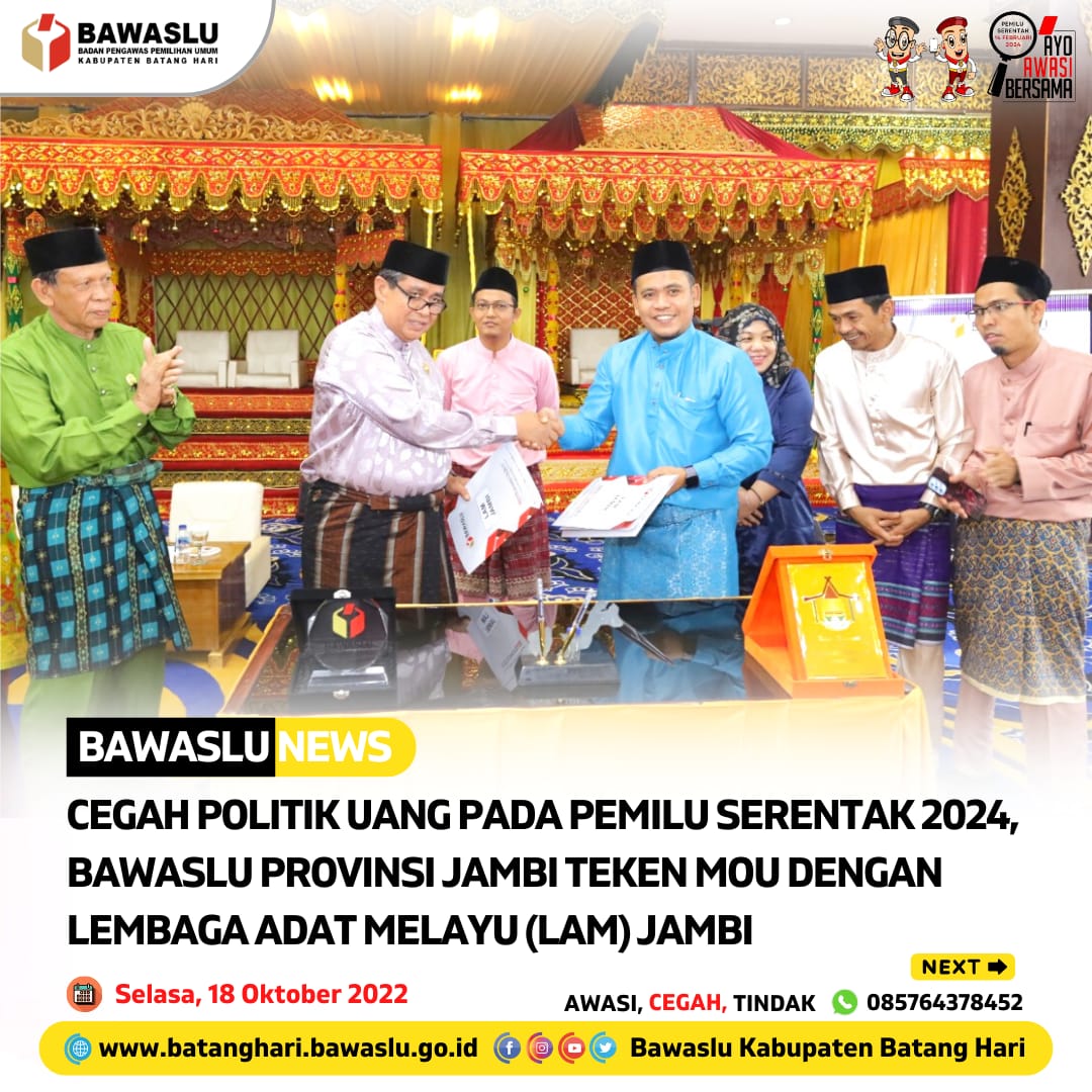 Jambi, Badan Pengawas Pemilihan Umum – Dalam memaksimalkan pengawasan partisipatif dan sebagai upaya pencegahan praktik politik uang pada penyelenggaraan Pemilu 2024. Bawaslu Provinsi Jambi melakukan penandatanganan MoU dengan Lembaga Adat Melayu (LAM) Jambi Provinsi Jambi, yang berlangsung di Balairung Sari Gedung LAM Jambi di Kawasan Telanipura Kota Jambi, Selasa (18/10/2022).
