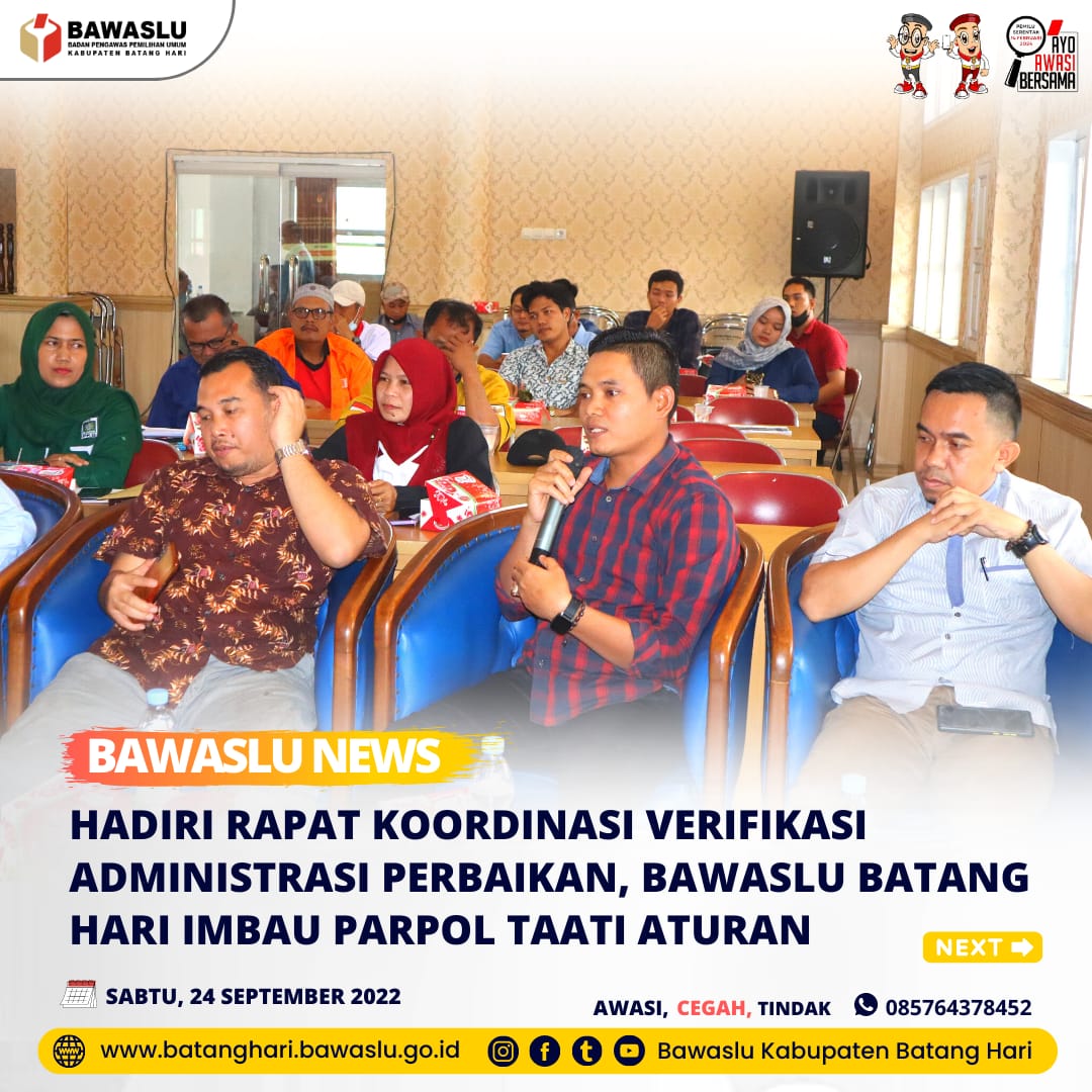 Kegiatan dihadiri Ketua Bawaslu Batang Hari Indra Tritusian, S.Pd.I, Anggota Bawaslu Batang Hari Iskandar, SE, Ketua dan jajaran Komisioner KPU Batang Hari, Perwakilan dari Polres Batang Hari, Kesbangpol Batang Hari dan perwakilan dari Partai Politik calon peserta Pemilu 2024. Kegiatan dilaksanakan guna mensosialisasikan mengenai jadwal Vermin perbaikan keanggotaan serta peraturan yang harus ditaati oleh Parpol.