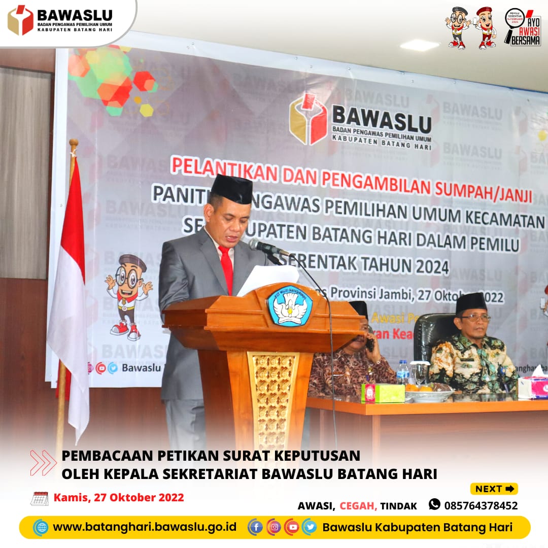 Ketua Badan Pengawas Pemilu (Bawaslu) Kabupaten Batang Hari, Indra mengatakan 24 orang Panwaslu kecamatan yang di lantik ini untuk menduduki masa kerja hingga akhir tahapan pemilu 2024 mendatang.
