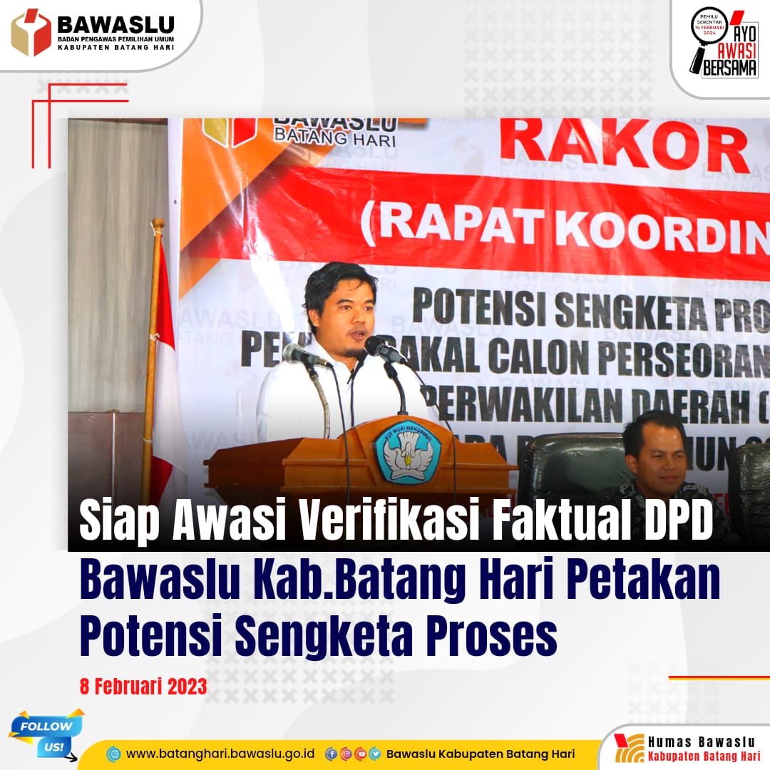 “3 Potensi tersebut sangat mungkin terjadi mengingat setiap bakal calon DPD tentu ingin menjadi lulus menjadi calon Anggota DPD nantinya, untuk tugas Bawaslu sebagai lembaga Peradilan/Hakim ini sangat berat, sehingga harus dipertimbangkan dengan matang khususnya dalam memutus suatu perkara dalam persidangan sengekta proses,” tutupnya.
