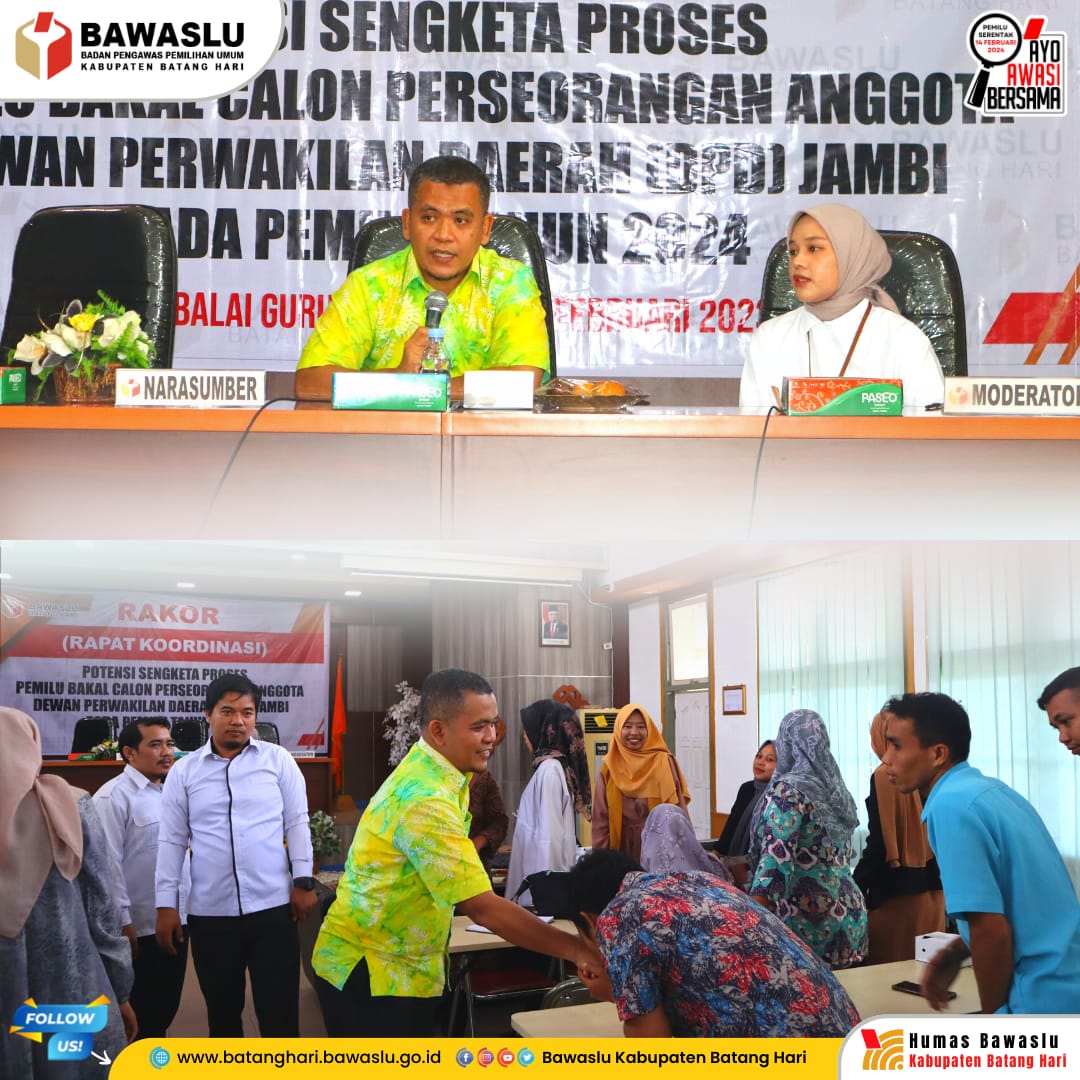 Dalam Sambutannya Anggota Bawaslu Kabupaten Batang Hari Andi Kurnia, S.Pd.I selaku Koordinator Divisi Penanganan Pelanggaran dan Penyelesaian Sengketa Proses menjelaskan potensi sengketa sangat besar terjadi di proses tahapan pencalonan anggota DPD.