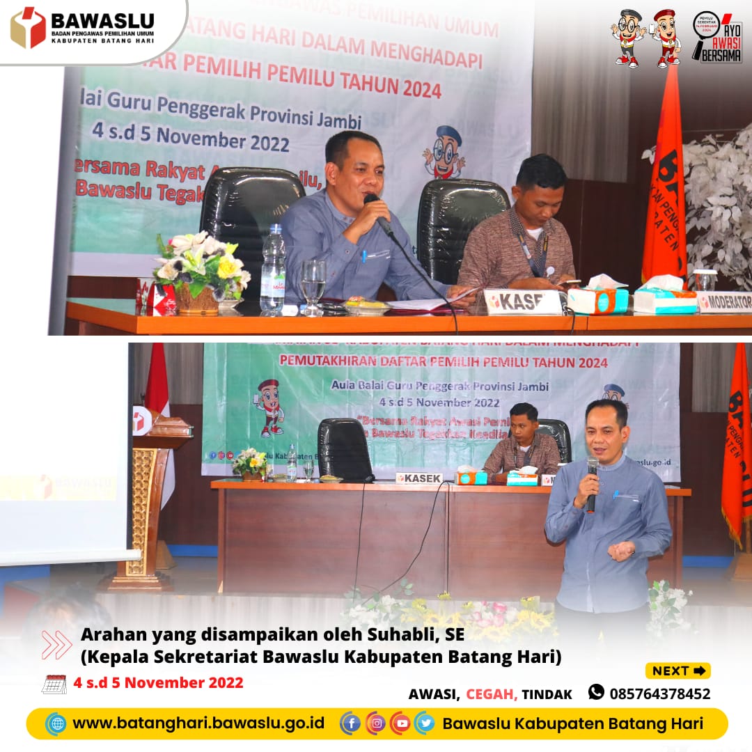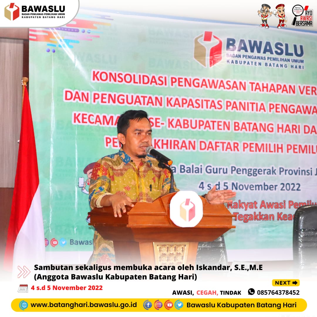 Lebih lanjut Penguatan kapasitas anggota Panwaslu Kecamatan melalui konsolidasi merupakan upaya Bawaslu Kabupaten Batang Hari untuk peningkatan kinerja pengawasan dalam rangka mengawasi tahapan verifikasi faktual partai politik calon peserta pemilu Tahun 2024 dan Pemuktahiran Daftar Pemilih tahun 2024.