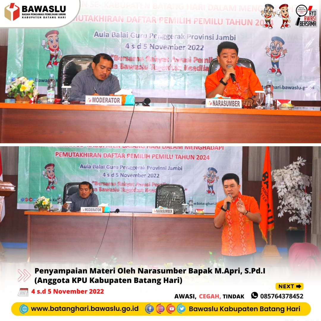 “Semoga kegiatan ini bisa menghasilkan output yang bermanfaat untuk teman-teman Panwaslu Kecamatan Se-Kabupaten Batang Hari dalam rangka pelaksanaan tugas dan fungsi pengawasan pada penyelenggaraan tahapan Pemilu 2024” tutupnya.