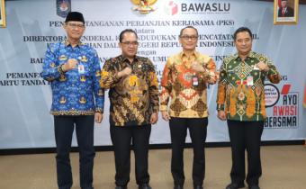 Plh Sekjen Bawaslu La Bayoni dan Dirjen Dukcapil Zudan Arif Fakhrullah saat Bawaslu melakukan Kerjasama Dengan Dukcapil, Kemendagri, di Kantor Bawaslu, Kamis (22/12/2022).